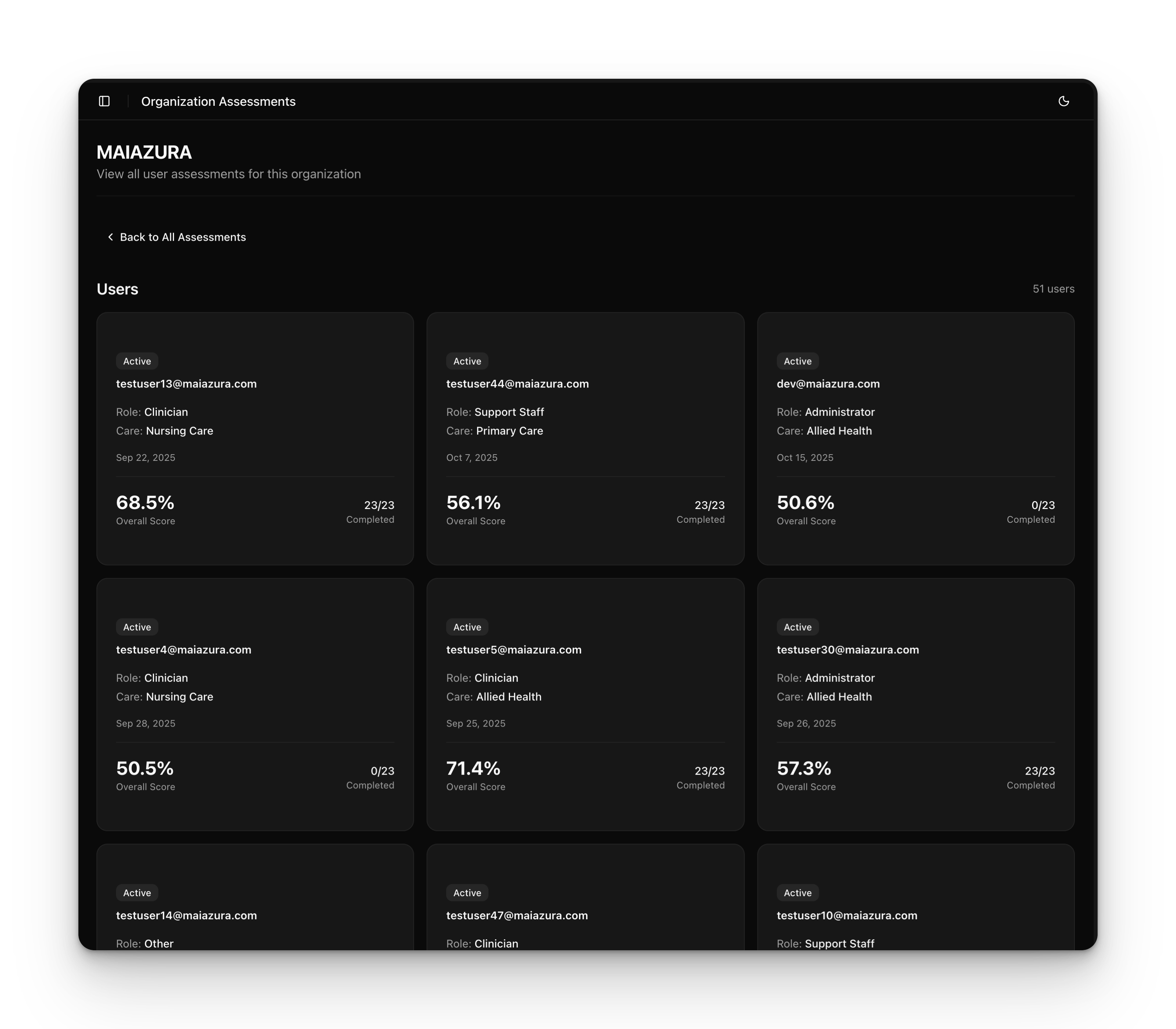 Healthcare organizations setting up team assessments can invite unlimited team members via email or organization links. All responses automatically aggregate into your organizational dashboard with full filtering capabilities.